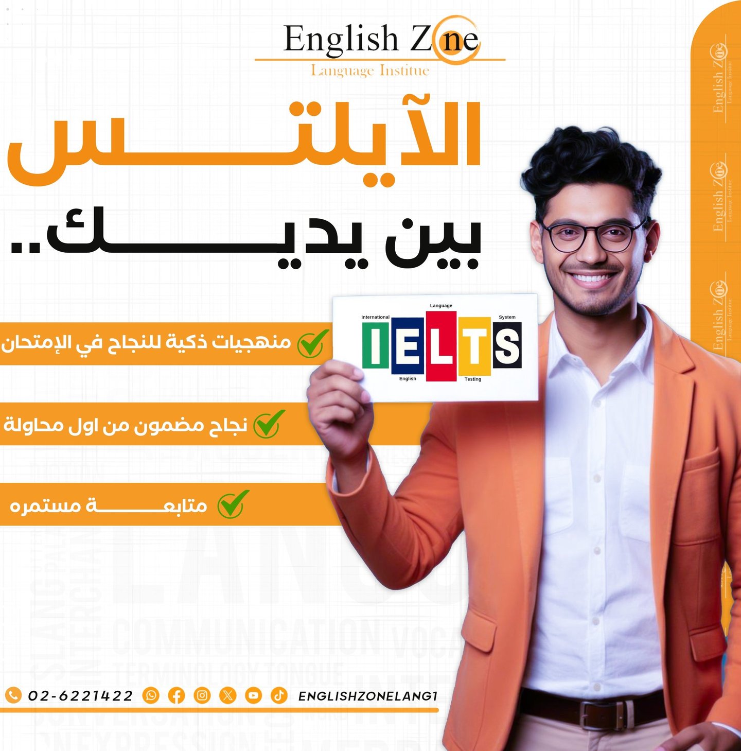 لا تضيع وقتك في البحث عن طرق للتحضير للايلتس. اختر معهد إنجليش زون واحصل على التدريب المكثف والمتخصص الذي يحتاجه مستقبلك. تواصل معنا اليوم وابدأ رحلتك نحو النجاح في الايلتس.